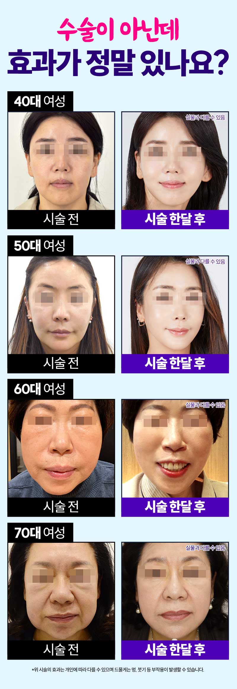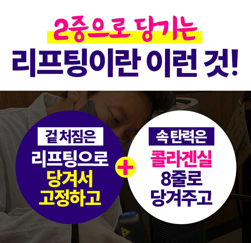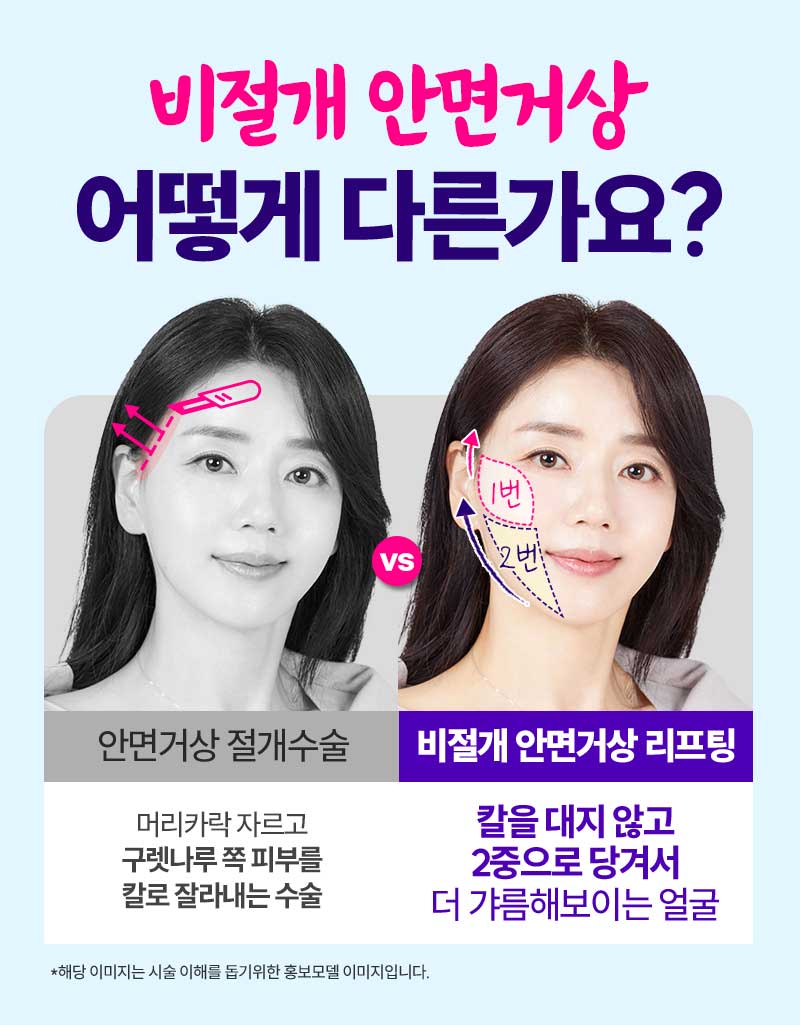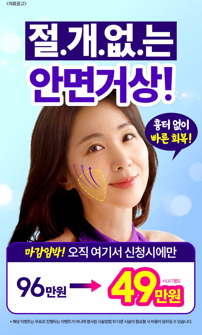 ※ 개인에 따라 시술 결과는 다를 수 있으며 멍, 붓기 등 부작용이 발생할 수 있습니다. ※ 안면거상리프팅 : 정가 96만원 -> 49만원(vat별도)